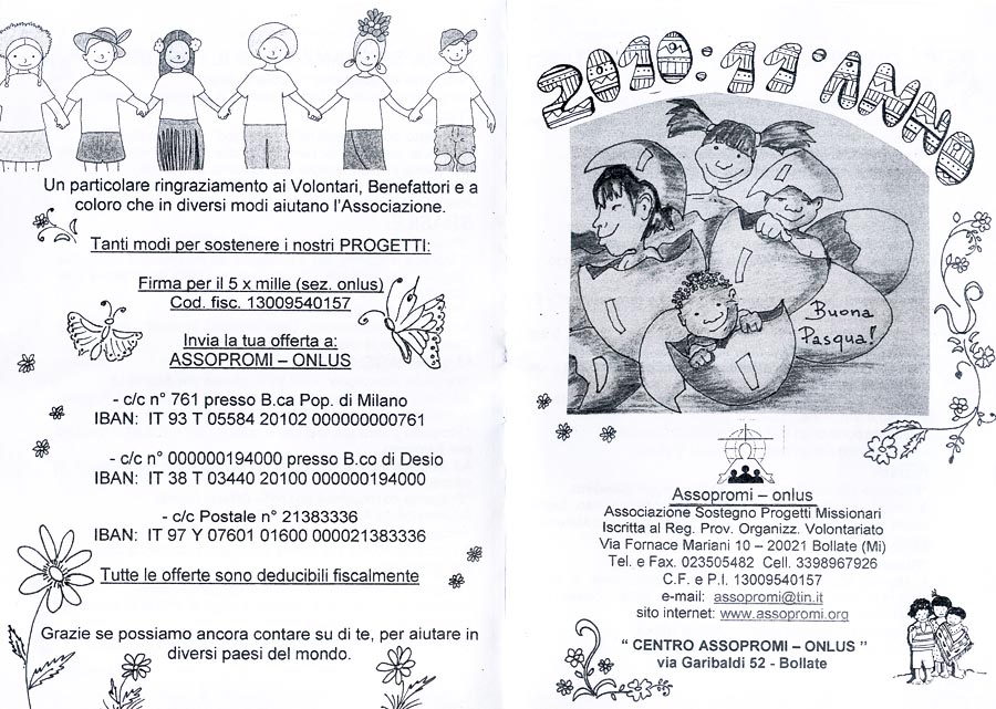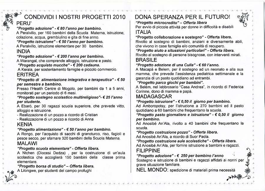 Chi siamo...     Dalle missioni     Suor Paola     Progetti     Attività     Per contribuire...     Link utili     Riconoscimenti     Interventi Diretti